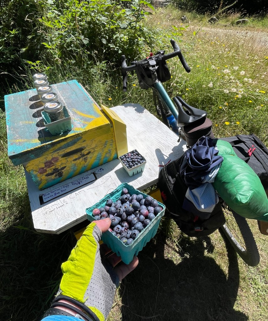 Day 3 started with 20 miles of treacherous gravel. I slogged up the hills and white-knuckled my way down them. By the time I reached Highway 101, I was completely out of food. With no services in the next 75+ miles I decided to take the 101 through Queets. This was the only section where I didn’t follow Miguel through the mountains. I was a bit frustrated with myself for not preparing thoroughly when I noticed a blue and yellow farm stand with fresh blueberries for sale. 2 pints for 5 dollars… I packed one and devoured the other.