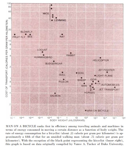 Another major realization I had was just how efficient it is to travel by bike. Not only is it “greener” than driving, it’s also cheaper, since you won’t be paying for gas, campsites, parking and speeding tickets. In 1973, S.S. Wilson wanted to prove that migratory birds were the “masters of efficiency- which turned out not to be the case.” He used data compiled by Vance A. Tucker of Duke University (see chart below) to compare various animals and forms of transportation, with Body Weight (Kilograms) on the X-axis and Cost of Transportation (Calories per Gram per Kilometer) on the Y axis. In fact, a man on a bicycle is more efficient than another animal on earth, as well as cars and planes. There’s a fun fact to share on your next group ride 🙂